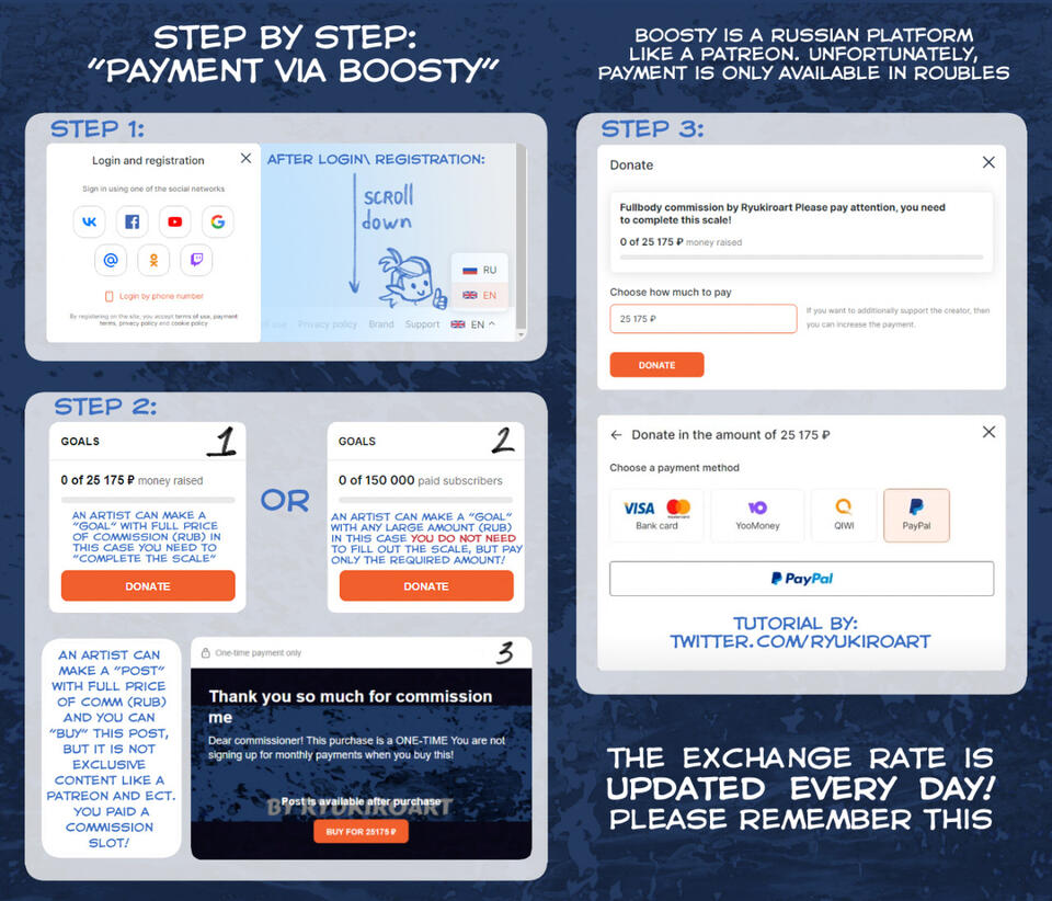 I am currently accepting payment via Boosty, at the rate of the Central Bank of the Russian Federation. Here is a simple guide on payment.